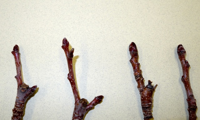 Honeycrisp buds collected 3/31/14. Two buds on left, although appear to be flower buds, are, much smaller (less "fat") than buds on right. Two buds on left are likely to be "blanks."