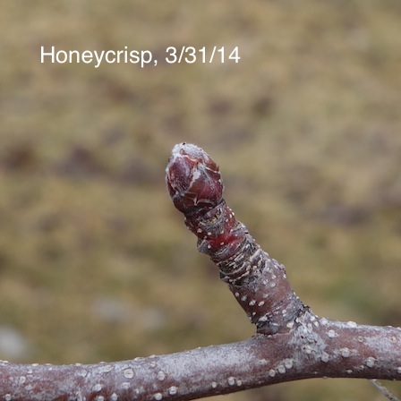 Current bud stage pictures will start next week. As of March 31, 2014, with snow on the ground at the UMass Orchard in Belchertown, buds were still dormant. Although this Honeycrisp bud looks pretty swollen!