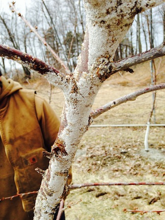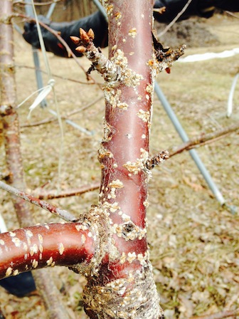 Last week I ran across this rather heavy infestation on sweet cherry of what I believe is white peach scale/white prunicola scale. (It’s an academic point which species it is unless you are an entomologist I suppose?) Note this is not the more common San Jose scale, which does seem to be becoming more abundant too. Of interest is the fact that this scale has traditionally been a more southern species, but this is the second time I have ran across it now. (The first, in the fall of 2012 in a peach orchard in southeastern MA.) The first picture (below) is a more typical scale appearance, but note on the opposite side of the tree is the feathery coating produced when scale sheds it’s skin over time (second picture below). Although not widespread on many trees, this infestation deserves serious treatment: the 2014 NETFMG suggests oil (2%), Assail, Centaur, Esteem, or Lorsban as treatment options in the late dormant bud stage. All growers should be on the lookout for scale (all kinds) and re-consider late dormant oil applications at 2% to keep it at bay.