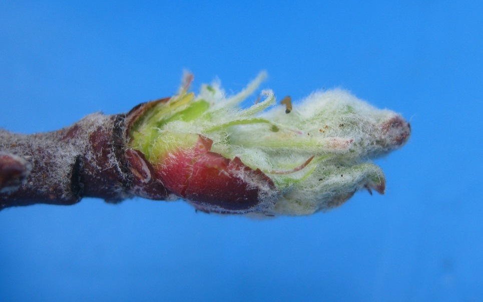 Winter moth update (April 17, Heather Faubert, URI) If you have a magnifying glass (10x is good) and you want to look for winter moth caterpillars, attached are a couple of pictures to help. Caterpillars are inside buds now, so to see winter moths, buds need to be peeled open. If a bud has caterpillars it is easier to find frass (insect poop) than caterpillars. Frass looks like small flecks of brown-black pepper in blueberry buds. In apples the frass can be reddish-brown to black. At URI's East Farm we sprayed March 30 for winter moth. We did not get very good control - though we don't know how many caterpillars would be there if we didn't spray. I think our poor control is due to winter moths hatching over a long period due to cool weather once eggs started hatching around March 27. Rain and snow washed off insecticide and the insecticide didn't last through the entire time eggs were hatching. We intend to spray apple trees and blueberries this coming week once fruit buds are at the tight cluster bud stage. Attached are pictures of apple and blueberry tight cluster.