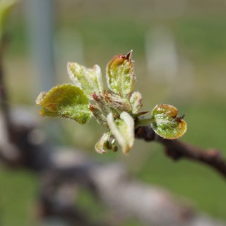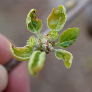 • You want the bad news first? After looking at a lot of apple buds, I am estimating the damage (from early April cold presumably) to individual buds (and spur leaves) to be approximately 50% across the board. It is now becoming more evident (w/o cutting) which buds are good and which are not. (See pictures below.) As we get into pink and bloom it will become even more clear. Now the good (better?) news? We're all in agreement if everything goes well for the next few weeks, there are plenty of live apple buds to set a crop. But, don't take any chances -- get bees in on on time, apply foliar nutrients, avoid applications of anything that might further damage spur leaves or buds (oil, copper, captan, surfactants, tank-mixes of almost anything, particularly a liquid crop protectant, etc.) Still, what happens from here-on-out is largely beyond our control so let's hope for some favorable weather at least. JC