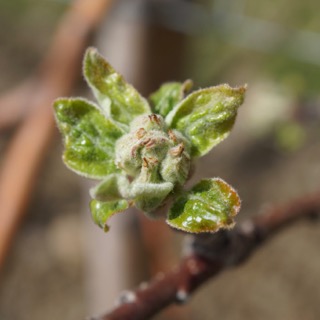 ![]() apple bud 19-April with 5-6 individul flowers; a bit out of focus, but note the middle buds are not separating and expanding (they are dead) but the two outer buds are moving |