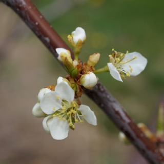 ![]() these test pluot selections are the only stone fruit with any bloom (to date, there may be some cherries still to come) at the UMass Orchard, 19- April; note however some missing petals, I suspect there is some cold damage (don't think they have fallen off yet) and un-emerged buds, but I can see a good, green style emerging (particularly evident in flower on right); these pluots are going to be worth lots of money this year (if I don't eat them)! |