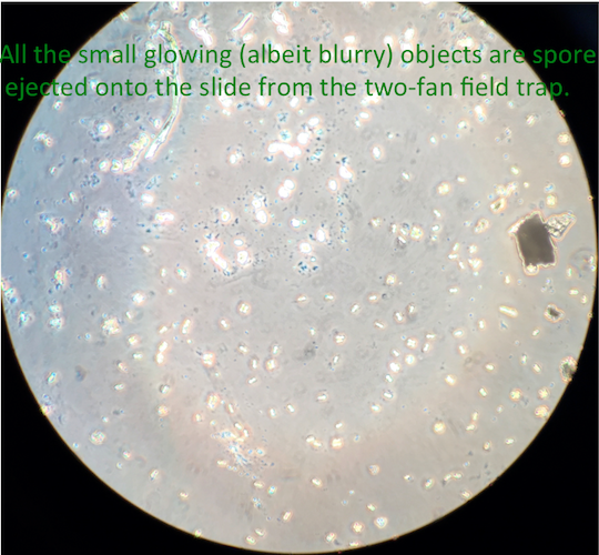In fact, this is exactly what Liz saw in her ascospore observations. In the outdoor trap, we saw tremendous numbers of ascospores. In fact, we have to show them to you. This is just one, microscopic part of spores we trapped from a set of about 15 leaves.