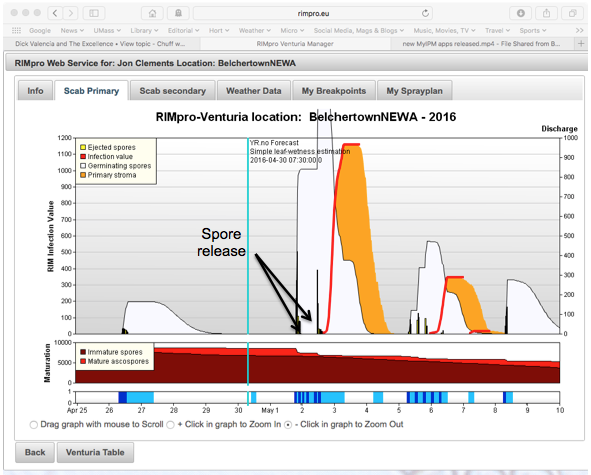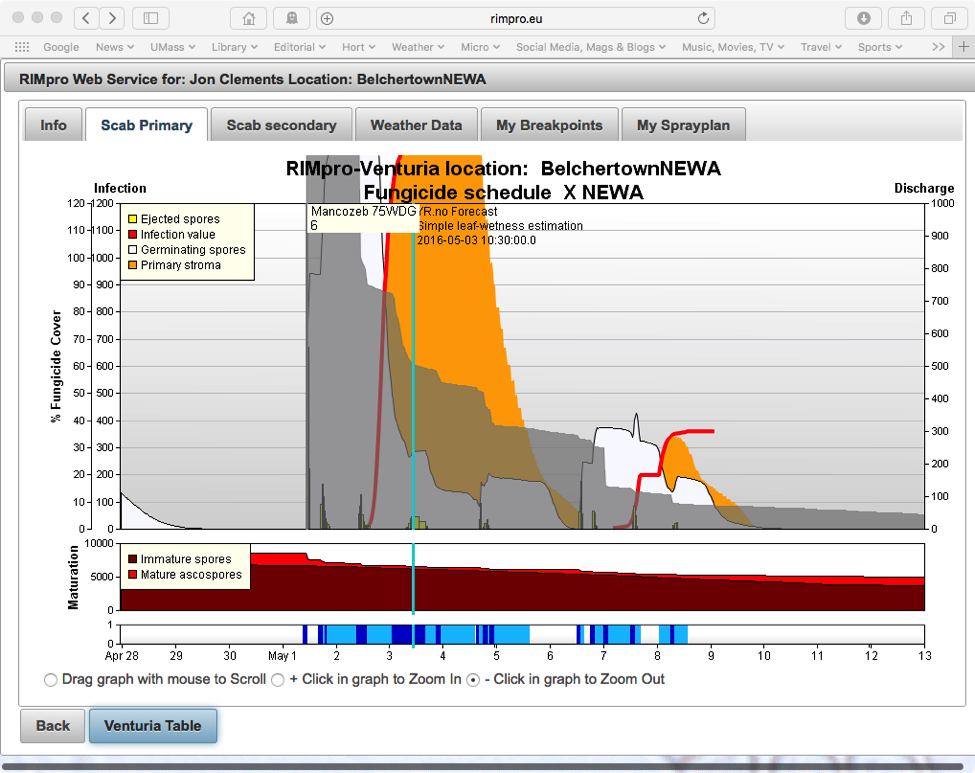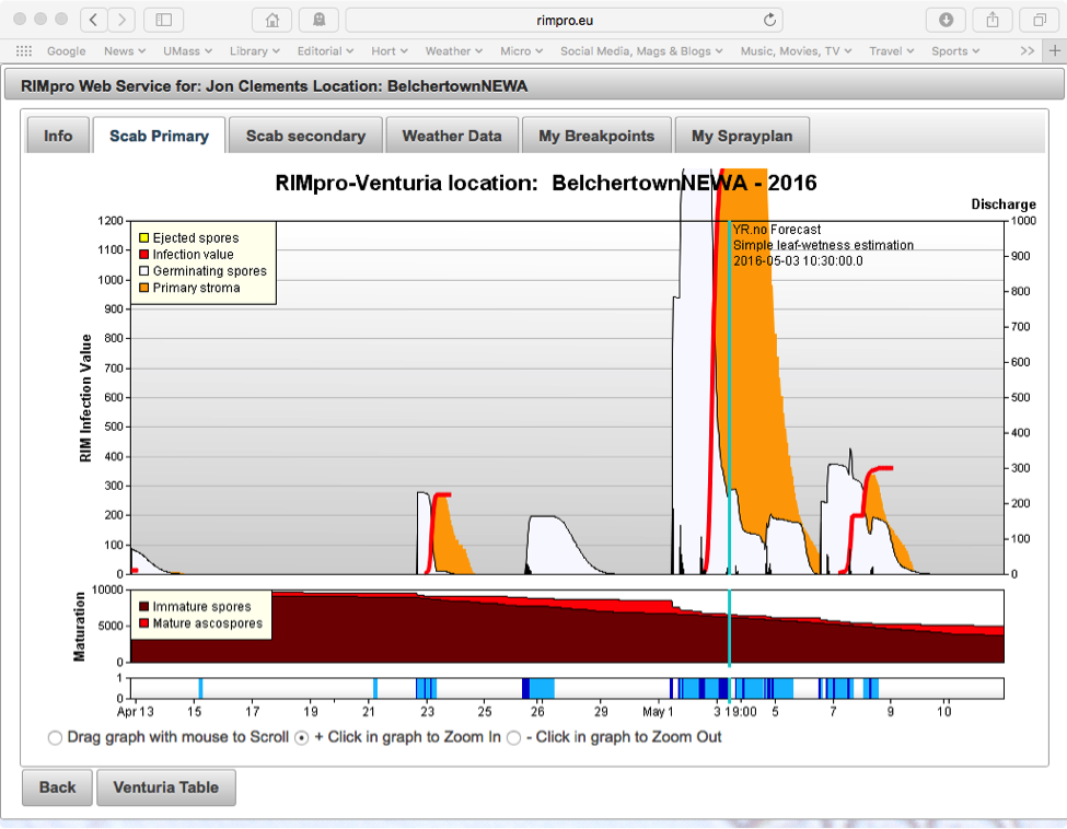 RIMpro shows when ascospores were released, when they are germinating, and when they have actually infected leaves. The small, upright bars colored yellow and black show spore release, in the white areas. In addition, in the box with the red areas above the wetting periods and below the main graph, RIMpro estimates the number of immature and mature ascospores at any time during the season. Here, the bright red shows a large percentage of the season’s spores were ready to go on May 1. The darker red shows that there are still a lot of immature spores that will continue to develop over the next couple of weeks. Over the last three days, approximately 20% of the seasons ascospore load was released. The large white areas show when the released spores are germinating on apple tissue. Germination doesn’t mean infection! It takes awhile for the growing spores to actually get into the leaf. That’s shown by the orange areas, what RIMpro calls “Primary stroma”. These shaded areas are primarily useful for detailed spraying using organically approved fungicides, though they also indicate when post-infection conventional fungicides will be most effective.