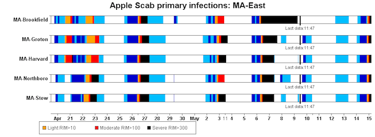 In Massachusetts so far this year we have had 3-4 important apple scab infection periods. For reference, see Regional Overview picts (MA-East and MA-West) from RIMpro below. (RIM value equates to infection potential.) Number 1: April 22-23. Number 2: April 26-27; Number 3: May 2-3. Number 4: May 6-7,8, which was a biggie. Based on the forecast(s) it looks like the next infection period will be May 14-15 app. At this time, spore maturity is such that 35-45% are still available to be released. Although not all will be released with the next infection. Get ready to spray: Mancozeb extended program (also good on rust), NO Captan after petal fall (risk of russet), SDHI's (good on mildew), DMI's (also good on mildew), QoI's (also good on mildew). Hint: should include something in the tank mix for mildew and/or rust to be safe, although mildew pressure has been light to date. Rust diseases, however, like this weather.