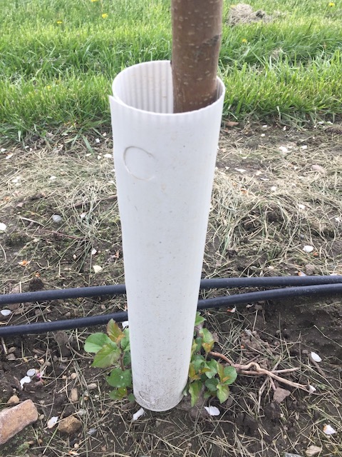 I want to piggy-back on Liz's concerns below about burr knots and dogwood borer DB in apples here. See picts below. These solid plastic mouse-guards/tree wraps/herbicide blocks, although initially seeming like a good idea, well after several years on these Gala/M.9-337, are not looking like such a great idea now. Darkness and moisture have made for nice, tender burr-knot formation, which we are guessing dogwood borer adults will like once they start egg-laying. We are taking these off ASAP and watching for DB infestation come June/July. My standard recommendation now for young plantings to prevent herbicide injury and manage burr knot/dogwood borer is: paint exposed rootstock, graft union, and trunks up to where branching starts with undiluted, white latex exterior paint the year of planting. This should be sufficient to prevent herbicide injury to young bark and last for several years at which point herbicide to trunks becomes less of an issue. (Still, don't blast the trunk with herbicides!) IF you can't manage your orchard ground cover sufficiently to prevent voles from taking up residence, then you better use hardware cloth/mesh mouse-guards. Although I will still not be happy, particularly if they are put on stone fruit!