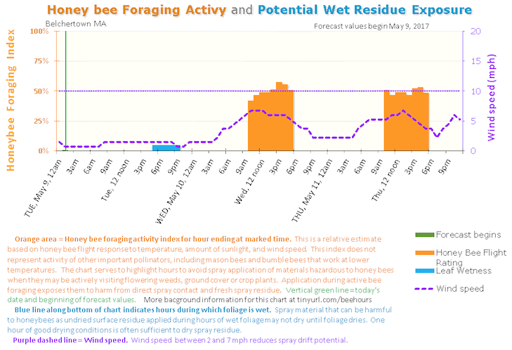 If you are looking for a quick, at-a-glance way to see if honeybees are active in your orchard, you can check out UMaine AgRadar’s honeybee foraging activity model. Pictured immediately below is the current foraging forecast for Belchertown.