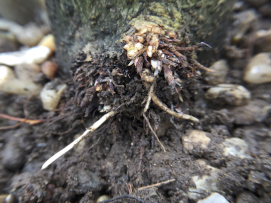 Burr knots, those pesky but often-avoidable root initials, are sending out new roots (bright white in the picture below) in this damp weather, especially where weeds have been permitted to grow up against the trunks. While there are a number of dwarfing and semi-dwarfing rootstocks available that are resistant to burr knot development, even those may form burr knots when weeds are allowed to grow in around them creating damp humid microclimates that stimulate adventitious root growth. An approximately 3’-4’ wide weed free strip in row is ideal.
