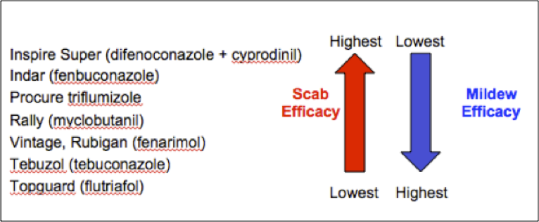 In varieties that are susceptible to powdery mildew and where mildew has been a problem in the past, use a mildew fungicide in this week’s applications. Rally and Topguard are excellent mildew and rust fungicides, but are not the most effective scab fungicides. Scab efficacy and mildew efficacy are virtually reversed. Scab is undoubtedly the larger problem at this point, so if using a DMI, select one with high scab efficacy such as Rally, Procure or Indar. Other systemic fungicides including Sovran, Flint, and Fontelis have good efficacy and will give adequate mildew control under typical situations in Massachusetts. Remember to mix any systemic with an EBDC or captan.