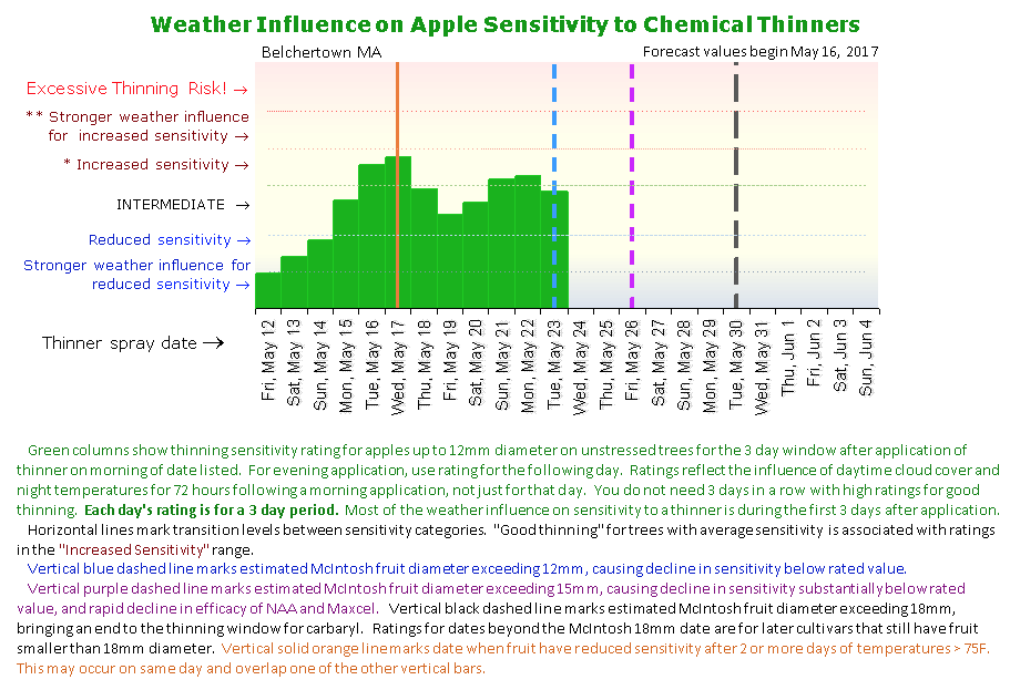 During this past week Alan Lakso, Cornell University, originator of the Carbon Balance Model, issued a warning relative to the use and accuracy of the thinning model this year. The data used to construct the Carbon Balance Model was collected in years when somewhat “normal” weather conditions prevailed. The two main inputs into the model are temperature and solar radiation. The model starts when the trees reach the green-tip stage and it continues uninterrupted throughout the season. The model does not provide provision for modification in years such as last year (very warm) or this year (very cold). Consequently, the output from the model can be somewhat unreliable.