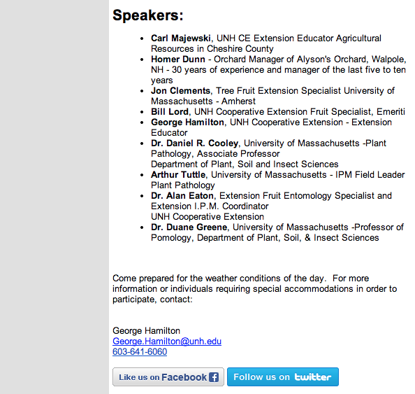 21-May, 2014 (Wednesday) Fruit Twilight Meeting at Alyson's Orchard, 57 Alyson's Lane, Walpole, NH (www.alysonsorchard.com). 5:00 to 8:00 PM. In cooperation with U. of New Hampshire Extension. 2 pesticide credits will be offered. Refreshments/snack will be served. Contact: George Hamilton, 603-641-6060. Also see below for further details.
