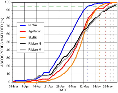 ![]() Scab ascospore maturity estimated by five different decision support models at the UMass Orchartd. The green dashed line shows 95% of ascospores have matured, considered the point at which the next rain will be the last ascospore release of the season. The earliest date, NEWA, was May 15, and the latest, RIMpro N, May 29, roughly a two week difference. Our spore counts agree much better with the later estimates. |