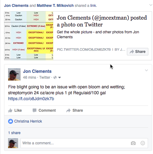 An application of 24 oz. per acre streptomycin plus 1 pt. Regulaid/100 gallons will reach back 24 hours, and protect flowers today and tomorrow (Wednesday). Where flowers continue to open on Thursday, another streptomycin application will probably be needed on Friday as risk levels will remain high into the weekend. Although, if you are at the tail end of bloom, and you sprayed strep yesterday or today, thus all your open flowers are covered, you are probably OK for the duration.
