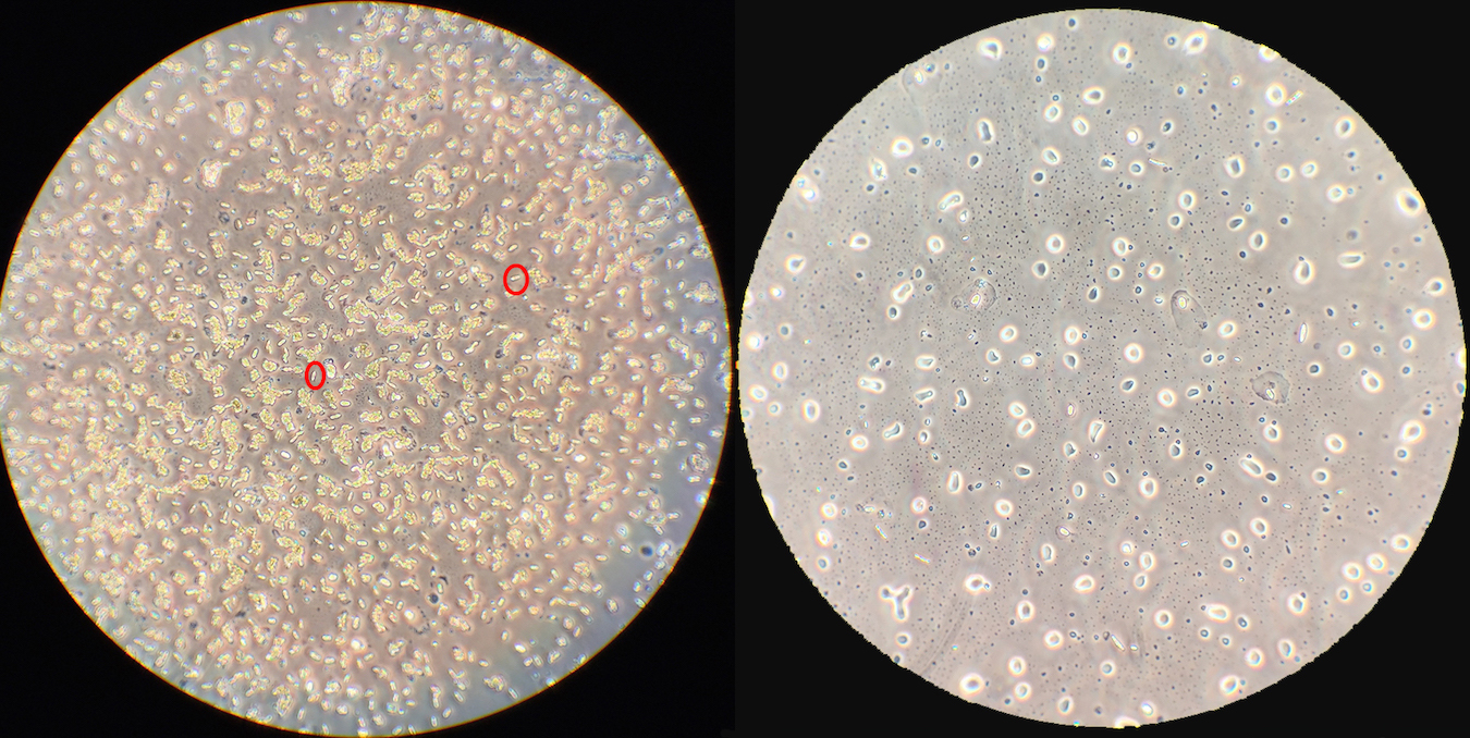Spore captures from Deerfield MA from two weeks. Last week, May 23 (left) shows abundant ascospores, with two typical spores circled in red. This week, May 30 (right) has no visible ascospores.