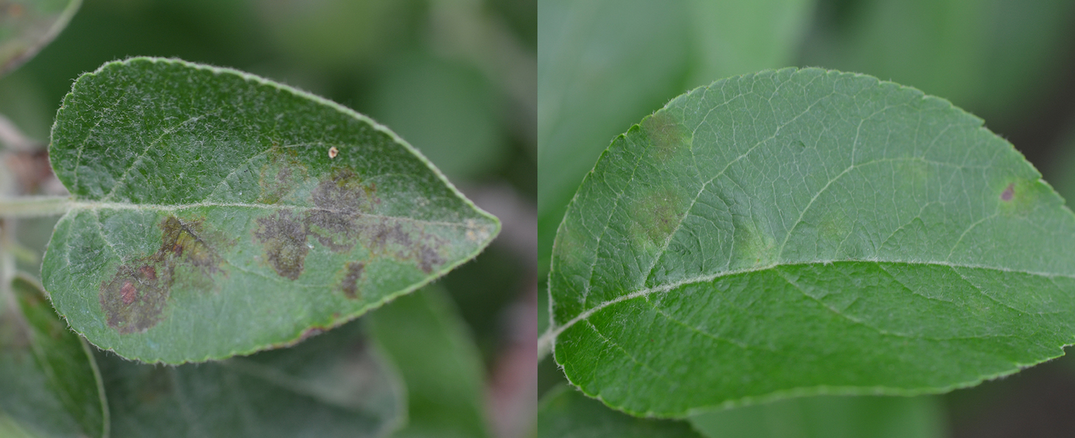 Secondary scab is clearly visible at this point. In orchards where infection occurred any rain at this time carries a significant risk of more scab infection. The picture below shows two types of scab infection. On the left is a picture of a scab infection that started early, at tight cluster, where the lesions have darkened. Fungicides have “burned out” these infections, which means they are no longer producing spores. The picture on the right shows active scab lesions, producing spores on more recently emerged leaves. These are the dangerous infections, and they’re harder to see.