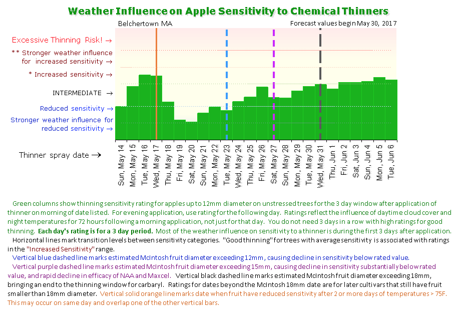 The desired crop load on these trees was decided to be 50 fruit (they are kind of short!) so there is a long ways to go for 10% fruit set (based on the potential of 500 flowers/fruits per tree to start). The decision was made to apply 6-BA at 100 ppm plus carbaryl at one pint on 28-May. We will see what happens. I will say, these three varieties had great bloom and appeared to be setting a lot of fruit. McIntosh seemed to be thinning down a little better, however, there was some variability observed there too. (I don't do McIntosh anymore :-)) What are you seeing out there? Certainly the weather has not favored strong thinning (yet). See chart below from AgRadar. Rumor has it fruit is not coming off readily, however, there is still some time for thinners applied last week to work. Don't panic, but if you do, and if you did not notice any significant tree drooping with your last NAA application (too cool?), you might want to get out there with another application of (particularly) NAA soon before the fruits get too large.