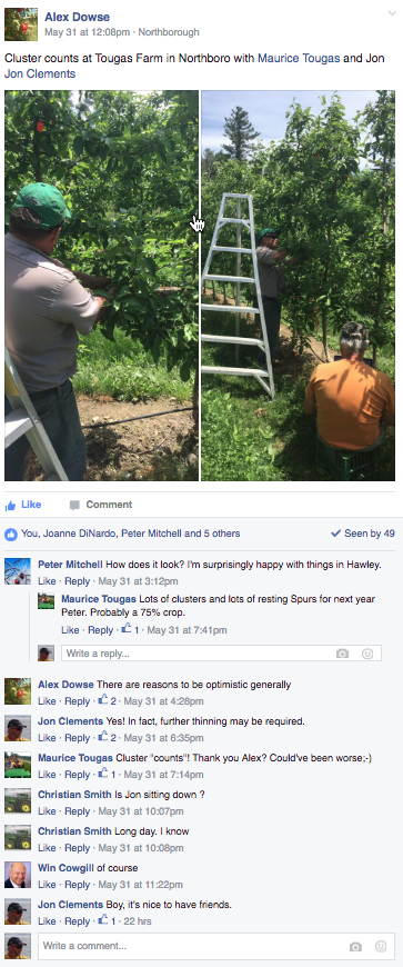 The apple crop is shaping up, but it depends. In the Worcester hills and points east the crop looks pretty good, at least 75-80% of normal. Colder sites fared worse. In the Pioneer Valley, well, things are not as good. The crop out there might be 50%, but again, it depends somewhat. I have not see the hill towns or Berkshires, I suspect they fared better than the Valley. All-in-all, it ranges from disappointing to meh to "what's the problem?" If you need to do some thinning, as fruits approach 18 mm, NOW is your last chance to apple carbaryl, NAA, or 6-BA. Expect moderate thinning at best at this point given the fruit size and weather.