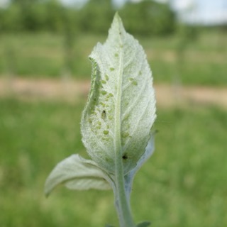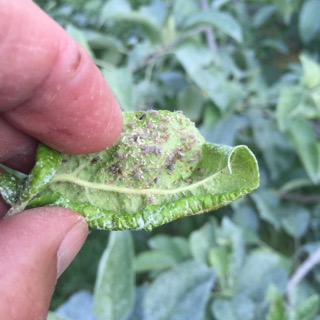 Rosy apple aphid (RAA) on curled apple leaf. Recommendation: RAA is a sporadic pest, but can be a significant problem on Golden Delicious and a few other varieties. Pre-bloom insecticides are most effective when there is a problem. Now, a systemic insecticicide (Movento is the gold standard) is the only answer. Well, we do IPM right? Then see next pict too. |