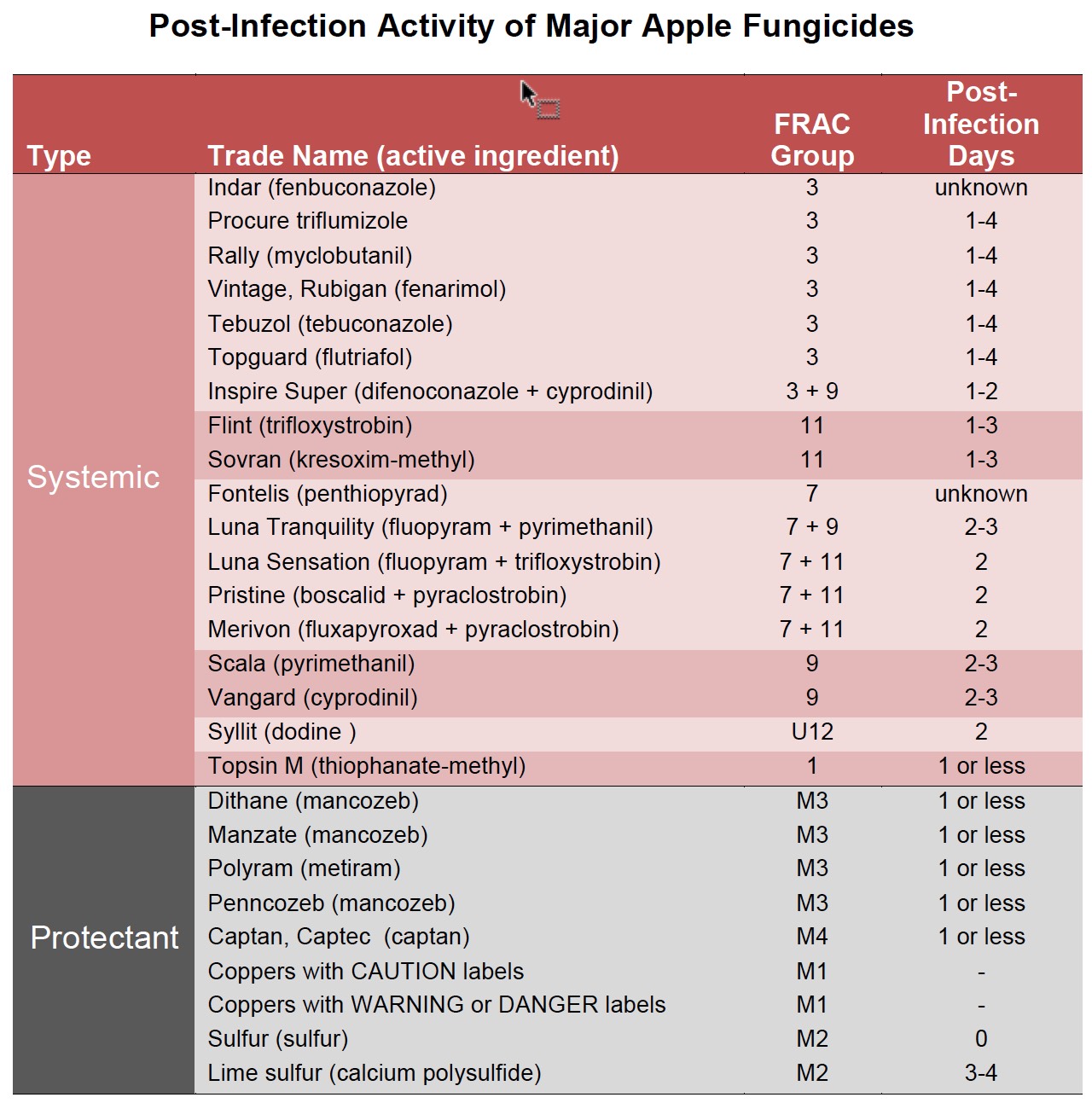 There are many post-infection options. Check the table below. Keep in mind what you have already used this year, and avoid using more than two applications of fungicides in the same FRAC group if possible. For example, if you’ve already used two applications of Flint (Group 11), avoid a third, as well as Luna Sensation, Pristine and Merivon which contain Group 11 fungicides. Instead, use one of the DMI fungicides (Group 3), such as Inspire Super, Indar or Tebuzol, or Fontelis (Group 7). We recommend mixing a protectant with any of the systemic products, but don’t mix captan with Fontelis as it may damage fruit. We don’t recommend using Scala or Vangard after fruit set because the Group 9 fungicides do not have good activity against fruit scab.