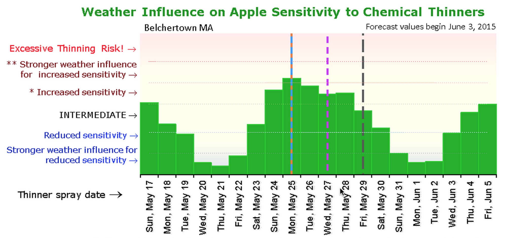 "For most of you, the apple fruit thinning window is over. Hopefully you applied chemical thinners during the time as seen below where chemical thinner activity was highest and you got (or are getting) good results. You should consider measuring fruitlets to see which are growing, and which are not, giving you a better idea of final fruit set. A little more time will tell better, but it's probably too late to apply thinners now, unless you choose to do a "rescue" thinning treatment using Ethephon (Ethrel). See: http://extension.umass.edu/fruitadvisor/sites/fruitadvisor/files/fact-sheets/pdf/F-129.pdf."