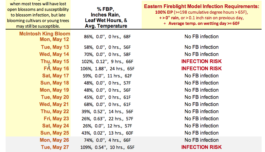 The hot topic is fire blight. No one seems to have fully escaped it. It's pretty clear to us there was a significant infection event in some orchards during bloom -- all three models we use (NEWA, AgRadar, and SkyBit) show a significant likelihood of an infection event around May 15-16. (See below, Figs. 1-3.) If you were in bloom, and there was fire blight in the neighborhood, and you did not spray streptomycin, you likely have fire blight symptoms now. There has been some discussion about shoot blight only, perhaps occurring during the infection event occurring around May 27, but my bet is on the earlier bloom timing. (And there may have been some lingering bloom into late May.) Some growers are surprised to see fire blight in McIntosh, but it is actually moderately susceptible. Highly susceptible varieties include Paulared, Gala, Ginger Gold, Golden Delicious, and Honeycrisp. At the UMass Orchard we are seeing it mostly in Gala, Golden Delicious, and Paulared. But many other varieties have fire blight too to varying degrees.