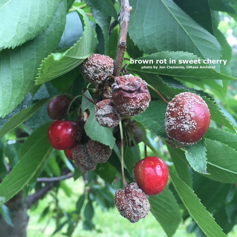 Pretty quiet this week so far. Peach hand thinning is ongoing, apple hand thinning to begin ASAP. (Getting it done earlier vs. later is better for return bloom.) Sprays for obliquebanded leafroller going on, pheromone trap catches continue to be high. Potato leafhopper has appeard with a vengeance in top-worked trees with succulent shoot growth and "hopperburn" (picture) already being observed there. Scab is out there where fungicide sprays were lacking. Cherry harvest has begun, and given the weather, brown rot (picture) is bad where it has not been adequately controlled. (Yuk!) I've heard reports of serious hail damage in western NY, the crop is down in Michigan because of spring freeze -- the Eastern apple crop is going to be down this year. Watch the sky, but there is nothing to do about it, cool air aloft spells hail, let's all wish it out of here though.