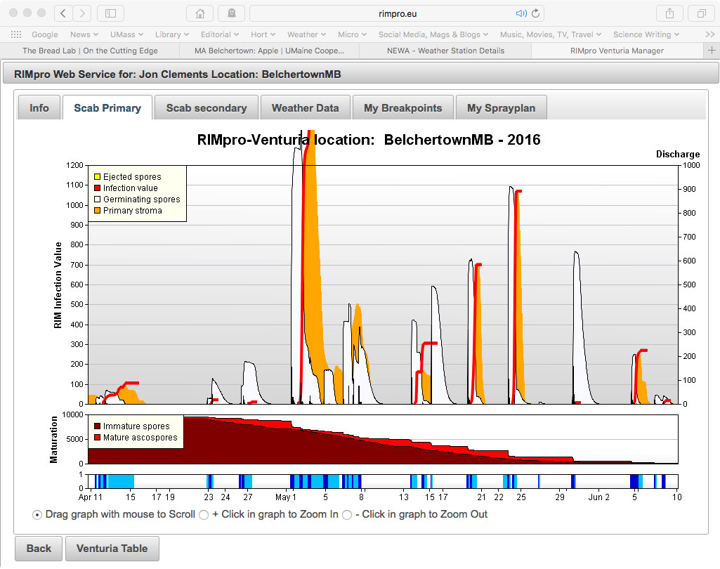 The 2016 primary apple scab season at the Hort. Research Center as modeled by RIMpro. The higher the red