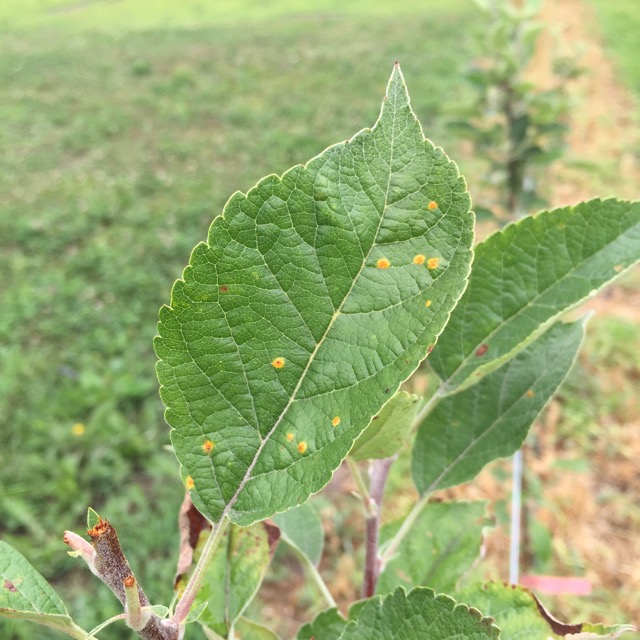 "Nice" cedar apple rust lesions on Calville Blanc apple foliage, 9-July, 2016