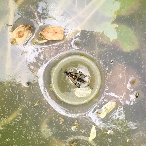 • Although we already noted that pheromone trap catches are down or non-existent, the exception is Dogwood Borer (DB), which we are still catching and to be expected. (See AgRadar). Here, a male (presumably) DB (nice specimen) was caught in a Z-trap baited with obliquebanded leafroller (upper left) pheromone.