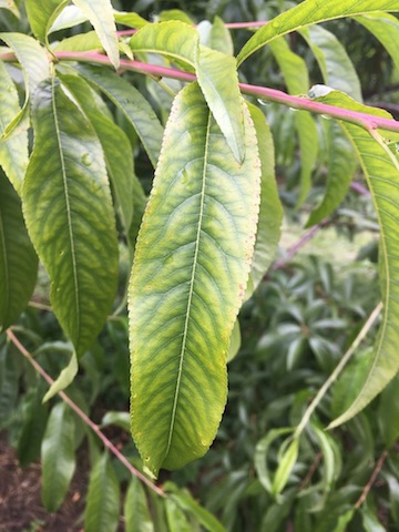 • Likely symptoms of magnesium deficiency were observed in a peach orchard. This I find to be fairly common, especially on light soils, and in a wet year. Grower is going to do a leaf analyis to confirm. Not sure how big a deal it is, but I would try to correct with soil applications of Sul-Po-Mag or K-Mag in the following season. Maybe foliar espsom salts (or formulated Mg product micro-nutrient spray) too?