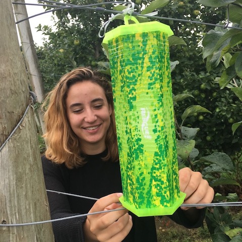 Nicole Foley, iPiPE intern, installing a BMSB trap in an apple orchard