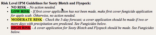 Other than brown rot management for peaches and nectarines as referenced above, sooty blotch/flyspeck and rots of apple (aka summer diseases) are top of the list right now. (Although I did recently find some nice mildew on Honeycrisp the mildew magnet, see it here, but right now you need to focus on mildew management next spring.) There are two online tools to help you manage (i.e. time) your summer fungicide program for summer diseases, AgRadar, and NEWA. AgRadar says you need to maintain "continuous fungicide coverage" until app. 30 days before harvest. "Continuous fungicide coverage" depends on type of fungicide used and how much rain there is between applications. Fungicides are basically batched into two groups: the protectants Captan and and Ziram (Group B); and fungicides with after-infection activity such as Pristine, Topsin-M, Flint, captan + phosphite (Group A). Group B is good for a 14 day (2 week) spray interval OR 1.5 inches of rain, whichever comes first. Similarly, Group A is good for 21 days (3 weeks) between sprays OR 2.0 inches of rain. Pretty simple. AgRadar presents comprehensive tables predicting fungicide depletion and when it is time to re-spray. For example, see the *FLYSPECK* tables for Belchertown. NEWA takes a slightly different approach. For example, using NEWA and assuming a last spray date of 14-July, then MODERATE RISK is predicted beginning 28-July (today) and if rain is forecast for 2 or more days, it is time to apply an appropriate fungicide (pictured). Please take the time to learn and use these weather-based IPM tools for more effective summer disease management. If any questions, contact Dan Cooley or myself.