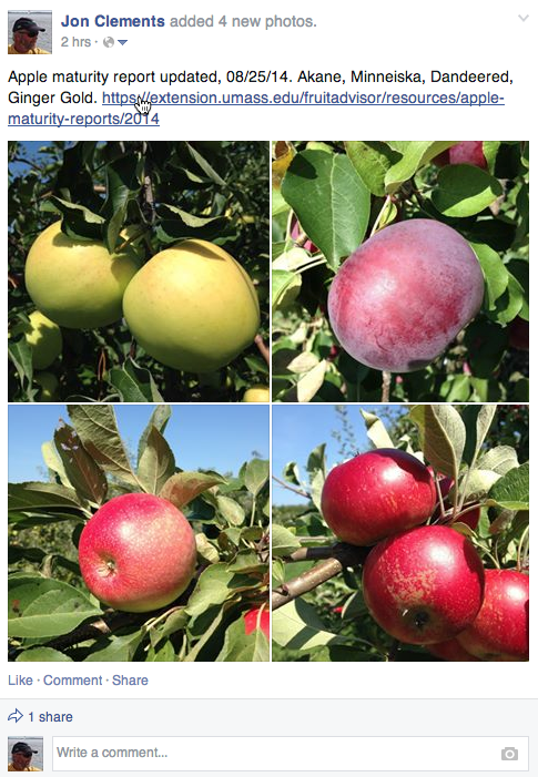 The next Healthy Fruit (and apple maturity report) will be published on Tuesday, September 9, or thereabouts, 2014. (In two weeks.) As always feel free to get in touch with any member of the UMass Fruit Team (http://extension.umass.edu/fruitadvisor/team-members) if you have questions or comments.
