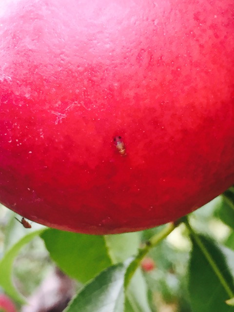 SWD male (with wing spots) and female (lower left, laying egg?) on Fantasia nectarine, 10-September, 2015 |