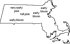 The good news is that apparently Massachusetts has not been hit with early scab, at least not to the extent seen in the Hudson Valley. Dave Rosenberger reported in this week's "Scaffolds" that there is quite a bit of early scab in commercial orchards in the Hudson Valley growing region. A spot check in Massachusetts, including non-sprayed trees, indicates that there isn't any scab yet. Apparently conditions were just enough delayed and/or slower that the wetting of April 1-2 did not cause the level of infections seen further south in New York.The bad news is that we are entering a very high risk period for apple scab. As of this writing, it appears that we are in store for several days of showers, starting tomorrow (April 30). This, the amount of scab inoculum mature and available (20 to 40%), and the amount of sensitive tissue make this a high risk period for scab. Don't take chances with fungicide programs now.