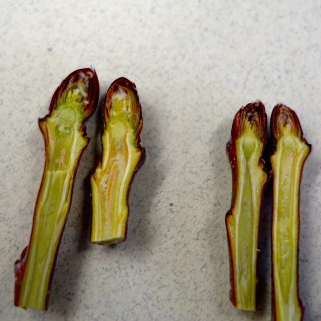 Honeycrisp buds collected 3/31/14. Two buds on left, although appear to be flower buds, are, much smaller (less "fat") than buds on right. Two buds on left are likely to be "blanks."