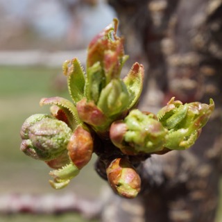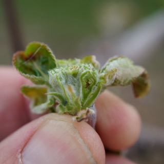• You want the bad news first? After looking at a lot of apple buds, I am estimating the damage (from early April cold presumably) to individual buds (and spur leaves) to be approximately 50% across the board. It is now becoming more evident (w/o cutting) which buds are good and which are not. (See pictures below.) As we get into pink and bloom it will become even more clear. Now the good (better?) news? We're all in agreement if everything goes well for the next few weeks, there are plenty of live apple buds to set a crop. But, don't take any chances -- get bees in on on time, apply foliar nutrients, avoid applications of anything that might further damage spur leaves or buds (oil, copper, captan, surfactants, tank-mixes of almost anything, particularly a liquid crop protectant, etc.) Still, what happens from here-on-out is largely beyond our control so let's hope for some favorable weather at least. JC