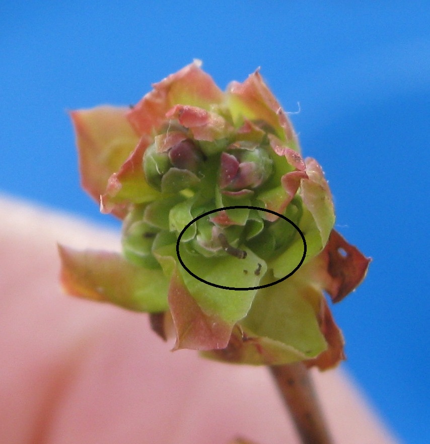 ![]() note flower bud on right sliced the long ways with dead ovary/style/stigma; no way this is going to set a fruit, even if it emerges with petals intact; other buds within the cluster may be undamaged |