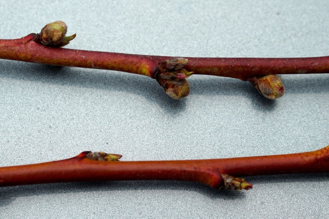 Peach shoots collected 4/22/2014 in same orchard, adjacent row, two different varieties. Top shoot has viable, swollen peach flower buds. Bottom shoot had non-existent, dried-up flower buds that were likely damaged by mid-winter cold temperature of -10 F. or below. Winter damage is highly site-dependent (how cold it got) and variety-dependent. |