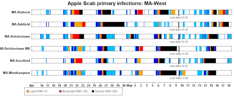 In Massachusetts so far this year we have had 3-4 important apple scab infection periods. For reference, see Regional Overview picts (MA-East and MA-West) from RIMpro below. (RIM value equates to infection potential.) Number 1: April 22-23. Number 2: April 26-27; Number 3: May 2-3. Number 4: May 6-7,8, which was a biggie. Based on the forecast(s) it looks like the next infection period will be May 14-15 app. At this time, spore maturity is such that 35-45% are still available to be released. Although not all will be released with the next infection. Get ready to spray: Mancozeb extended program (also good on rust), NO Captan after petal fall (risk of russet), SDHI's (good on mildew), DMI's (also good on mildew), QoI's (also good on mildew). Hint: should include something in the tank mix for mildew and/or rust to be safe, although mildew pressure has been light to date. Rust diseases, however, like this weather.