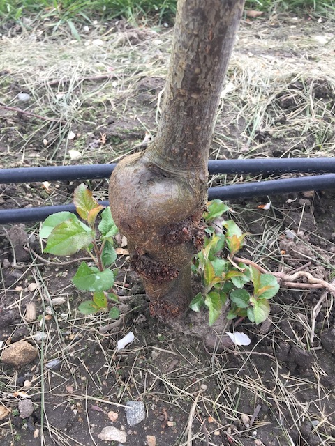 Burr knots, those pesky but often-avoidable root initials, are sending out new roots (bright white in the picture below) in this damp weather, especially where weeds have been permitted to grow up against the trunks. While there are a number of dwarfing and semi-dwarfing rootstocks available that are resistant to burr knot development, even those may form burr knots when weeds are allowed to grow in around them creating damp humid microclimates that stimulate adventitious root growth. An approximately 3’-4’ wide weed free strip in row is ideal.