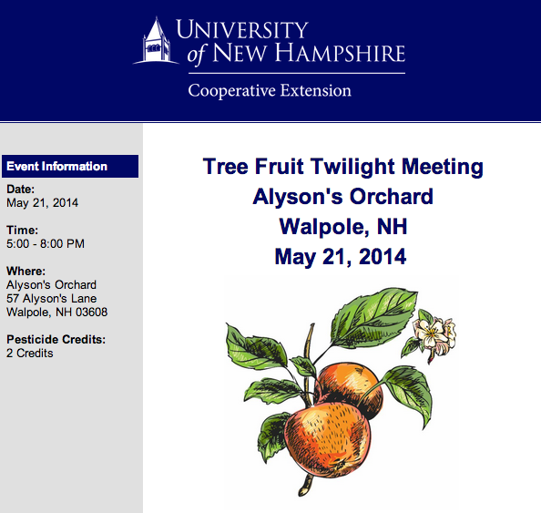 21-May, 2014 (Wednesday) Fruit Twilight Meeting at Alyson's Orchard, 57 Alyson's Lane, Walpole, NH (www.alysonsorchard.com). 5:00 to 8:00 PM. In cooperation with U. of New Hampshire Extension. 2 pesticide credits will be offered. Refreshments/snack will be served. Contact: George Hamilton, 603-641-6060. Also see below for further details.