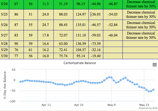 Chemical thinning, I am leaning towards needing more thinning now than we might have thought. Any damage wrought by the freeze has appeared, so what you are seeing now and you are thinking it needs some thinning, trust your instinct. Carbaryl is the most mild thinner, but this weekend is going to be a good time to apply Maxcel/ExilisPlus (6-BA), a moderate thinner at moderate rates, or Fruitone at 2 oz per acre (3 oz per acre in big trees) when more aggressive thinning is desired in blocks where fruit are clustered and appear to be growing. Probably not going to want to use combinations of chemical thinners. Only thin what needs to be thinned, blocks with good fruit set, tops of trees, etc. There will be a significant carbohydrate deficit in trees this weekend (see below), so they WILL respond to chemical thinners -- use judiciously, use low to moderate rates. Read more from Duane Greene...