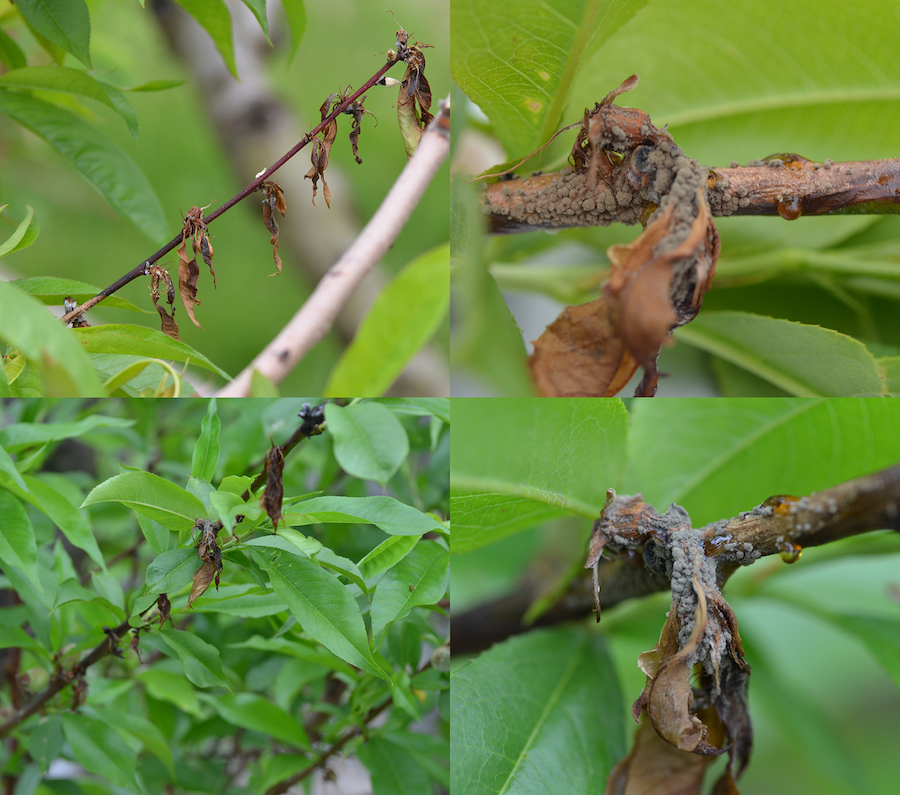 Peach brown rot blossom blight that has progressed to twig blight. Gray spores are clearly visible in close-ups on the right.