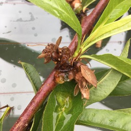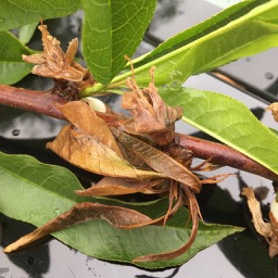 These infection should be pruned out during peach thinning. If not, it will make brown rot management on fruit that much more difficult.