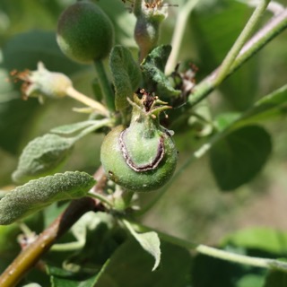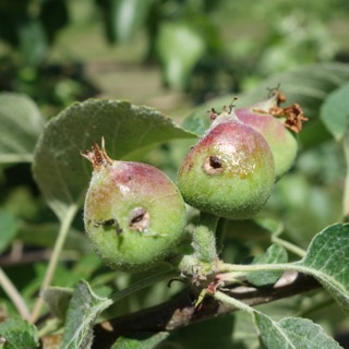 European apple sawfly damage is significatn in orchards with poor pre-bloom or petal fall insecticide coverage. Recommendation: too late to do anything now, hand-thin damaged fruit, be ready next year with pre-bloom and/or petal fall insecticides (Imidan). |