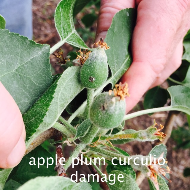 "Plum curculio (PC) were busy little buggers last week as predicted. Damage was easy to find in unprotected apple and cherry trees. (See pictures below.) We're not out of the woods quite yet, maintain some insecticide coverage to all trees or at least border rows to keep PC at bay. The NEWA PC models says we have accumulated 189 degree days Base 50 (though Monday, June 1), and we need to have 308 before the risk of having PC injury has passed. So that will be another week to 10 days depending on the weather. Keep your guard up: your insecticide options are many, however, Imidan continues to be the most effective PC spray.