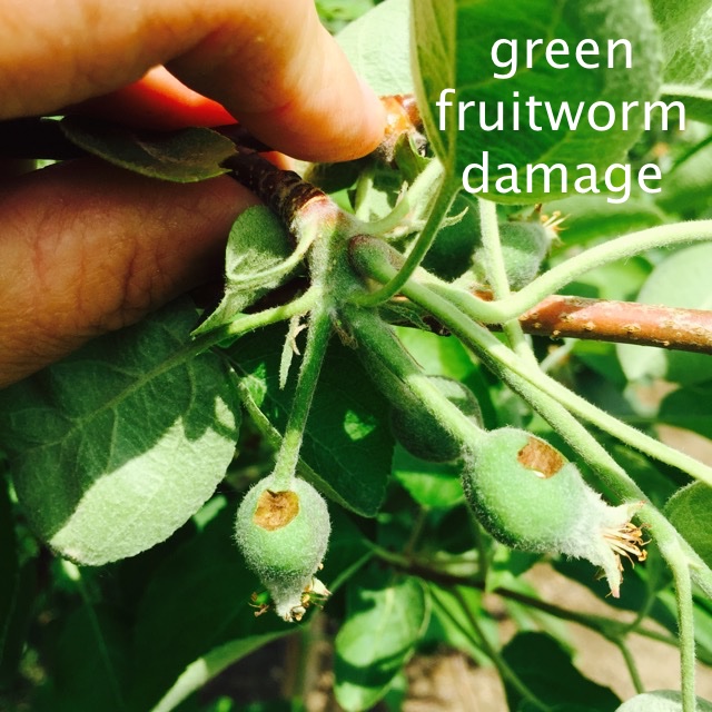 "We've also noted significant feeding damage from the onslaught of green fruitworm we had pre-bloom. (See picture.) Not much to do about it now, just recognize the damage, and in years like this with warm pre-bloom weather consider applying an insecticide at pink."