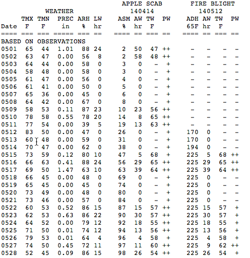 The hot topic is fire blight. No one seems to have fully escaped it. It's pretty clear to us there was a significant infection event in some orchards during bloom -- all three models we use (NEWA, AgRadar, and SkyBit) show a significant likelihood of an infection event around May 15-16. (See below, Figs. 1-3.) If you were in bloom, and there was fire blight in the neighborhood, and you did not spray streptomycin, you likely have fire blight symptoms now. There has been some discussion about shoot blight only, perhaps occurring during the infection event occurring around May 27, but my bet is on the earlier bloom timing. (And there may have been some lingering bloom into late May.) Some growers are surprised to see fire blight in McIntosh, but it is actually moderately susceptible. Highly susceptible varieties include Paulared, Gala, Ginger Gold, Golden Delicious, and Honeycrisp. At the UMass Orchard we are seeing it mostly in Gala, Golden Delicious, and Paulared. But many other varieties have fire blight too to varying degrees.